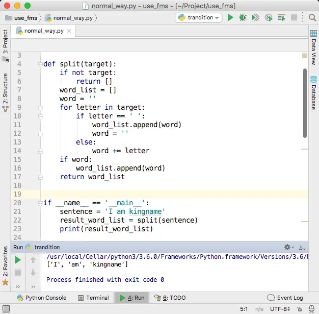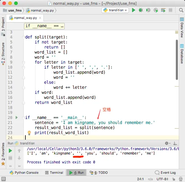 对于只有单词和空格,不含其他符号的英语句子,可以使用空格来切分单词。于是对于句子I am kingname, 一个字符一个字符的进行遍历。首先遍历到I,发现它是一个字母,于是把它存到一个变量word中,然后遍历到空格,于是把变量word的值添加到变量word_list中,再把word清空。接下来遍历到字母a,又把a放到变量word中。再遍历到m,发现它还是一个字母,于是把字母m拼接到变量word的末尾。此时变量word的值为am。再遍历到第二个空格,于是把word的值添加到word_list中,清空word。