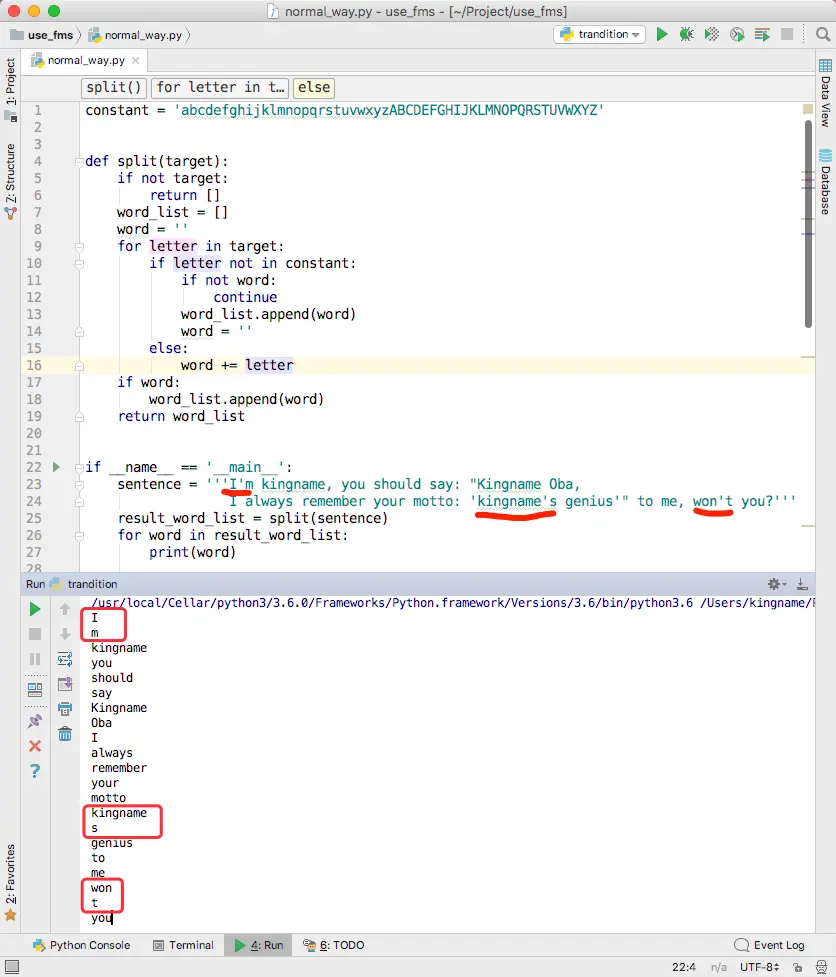 如果句子变成:I'm kingname, you should say: "Kingname Oba, I always remember your motto: 'kingname's genius'" to me, won't you?继续使用上面的代码,就发现返回的单词列表又不对了。如下图所示。