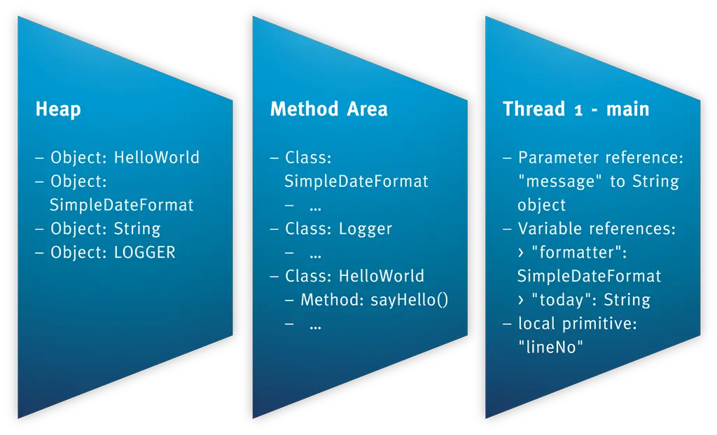 方法的执行都是伴随着线程的。原始类型的本地变量以及引用都存放在线程栈中。而引用关联的对象比如String,都存在在堆中。为了更好的理解上面这段话,我们可以看一个例子: