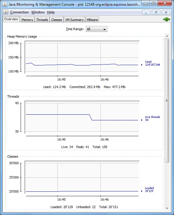 通过JConsole工具可以查看运行中的Java程序(比如Eclipse)的一些信息:堆内存的分配,线程的数量以及加载的类的个数;