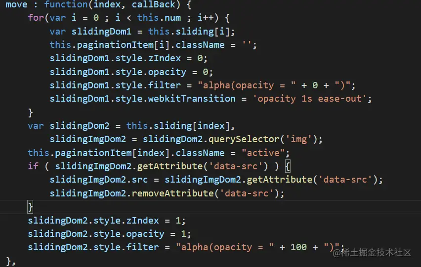 当用户点击左右或者下面的小圆点或者自动播放的时候 这里做一个说明,这3种事件都是调用了move方法,所以只要改一个地方就好了。
