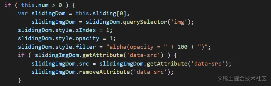 我们就可以在渲染插件里图片的时候将图片路径放在data-src(也可以其他不适src的自定义属性)里面,然后我们要做的就是在插件代码里面去控制什么时候去请求图片资源。我们来想一下,这样的轮播当用户点击左右或者下面的小圆点或者自动播放的时候就会请求新的图片资源。那么我们需要做的事情就是在这些事件中去将data-src改成src不就好了。不过对于第一张图片我们是需要特殊处理的,一开始就让他的data-src改成src就可。下面是代码片段截图