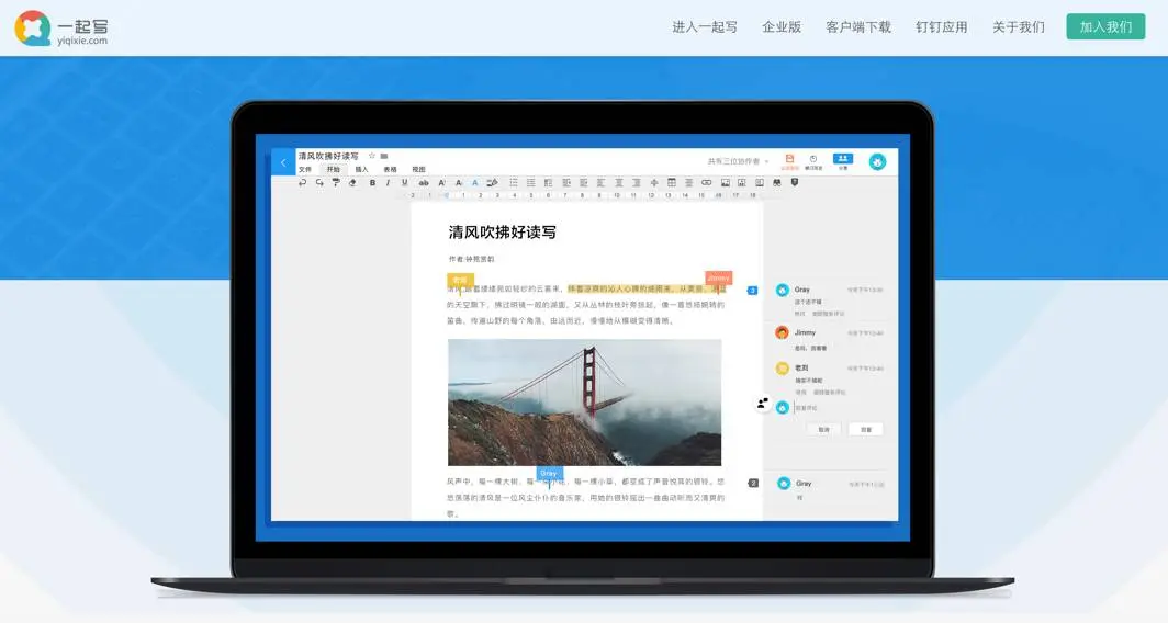 一起写是比较专业的企业版文档协作工具,有付费版和免费版。可以创建文档、表格、演示、画板、表单等,也可以导入 Word、Excel、PPT 或云盘文件,可实时多人在线同步编辑,并且可找回历史编辑记录。它也有个本地 APP 可以下载。