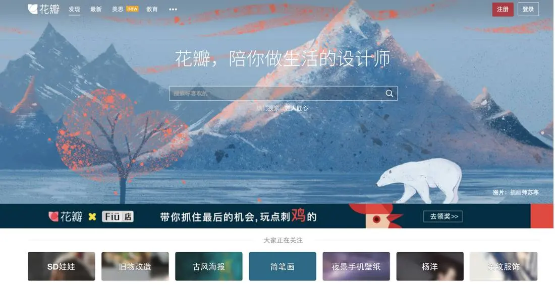 花瓣,中国版的 Pinterest,连设计都惊人得相似。不过内容还是不错的,上面有很多设计或插图的灵感画板。一个小秘密就是,很多微信自媒体大号都是在花瓣上找 Gif 配图的,因为素材真的好全!