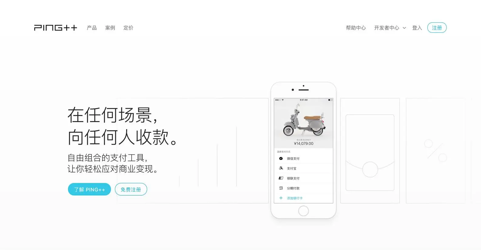 解析:Ping++,聚合支付系统。可开通多渠道支付,如微信、支付宝、银联、京东、Apple Pay等。只要一段代码,从手机 App、网页、微信公众号、微信小程序到线下二维码扫码,你都可以向用户收款啦。