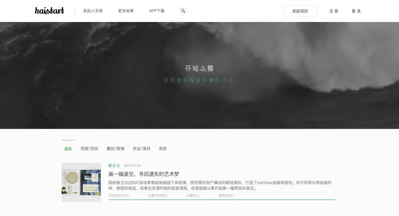 开始众筹,国内的众筹平台,于 2015 年获得天使融资,专注于新型生活消费领域众筹。上面可以看到很多有趣的民宿啊、餐饮啊、食材啊之类的项目。