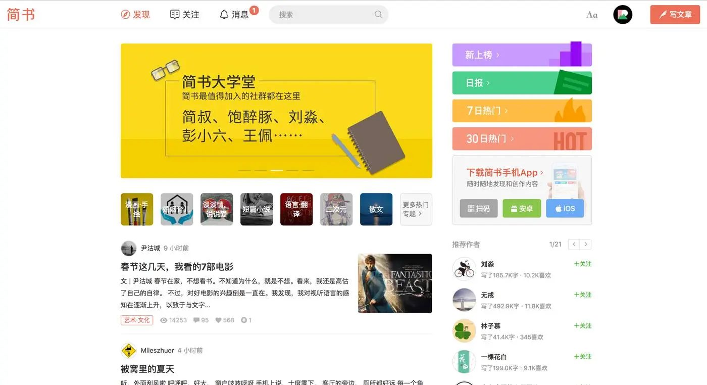 简书,一个将写作与阅读整合在一起的网络产品。跟专注于技术领域的掘金不同,简书上面的频道非常多,时事、历史、博物、小说等等。但你可以搜索关注互联网、创业、设计等频道袄。用户也是比较活跃的。