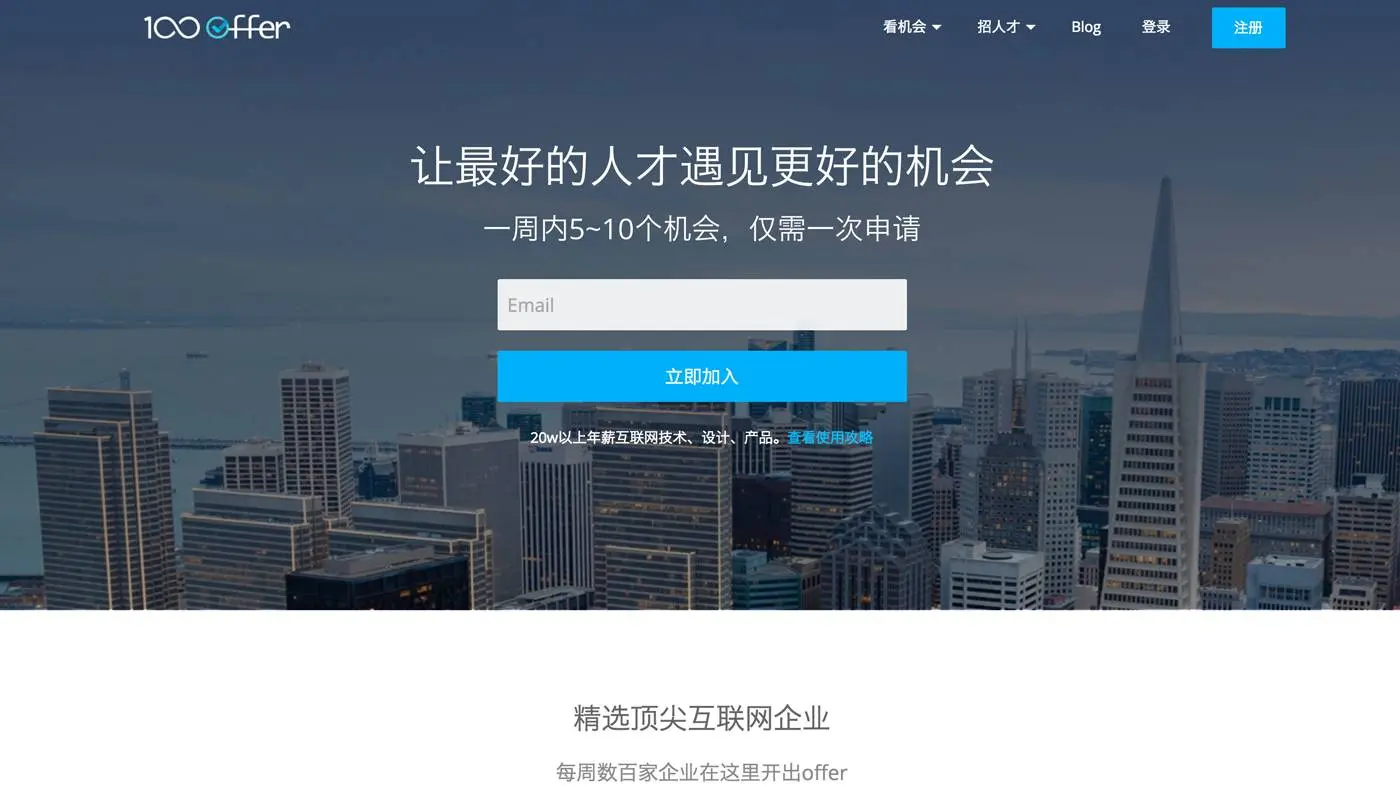 找工程师可以去 100 Offer,工程师质量都还不错,他们对平台上的简历质量有一定要求,工作经不足的审核不会通过,所以招聘的成功率高、薪资也高。适合已融到资的创业公司进行招聘。