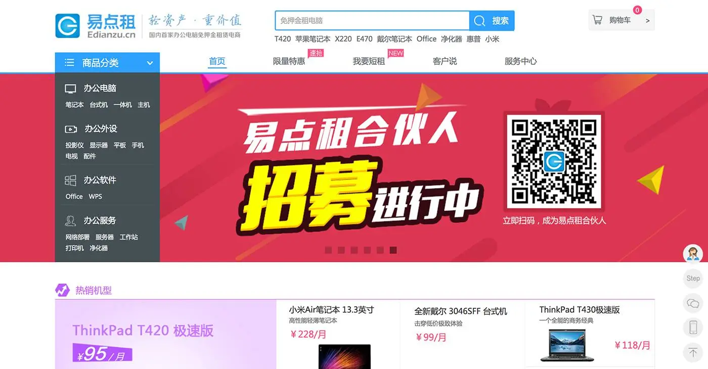 解析:有了易点租,创业公司再也不需要买电脑啦!不管是笔记本、台式机、一体机、还是投影仪、平板、手机、电视、打印机、净水器,统统可以用租的。