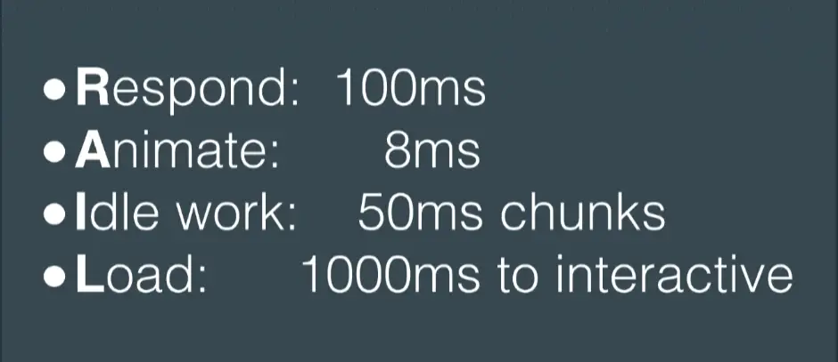 尽管目前没有高性能代码的绝对定义,但却存在一个以用户为中心的性能模型,可以用作参考:RAIL模型。