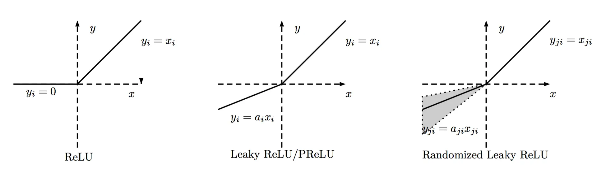 ReLU的区分主要在负数端,根据负数端斜率的不同来进行区分,大致如下图所示。
