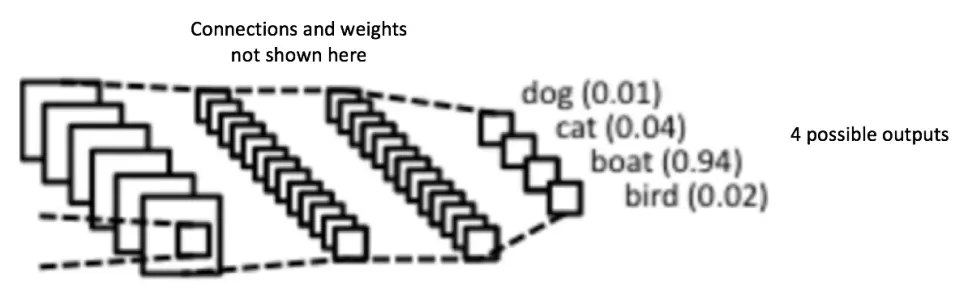 卷积和池化层的输出表示了输入图像的高级特征。全连接层的目的是为了使用这些特征把输入图像基于训练数据集进行分类。比如,在下面图中我们进行的图像分类有四个可能的输出结果(注意下图并没有显示全连接层的节点连接)。