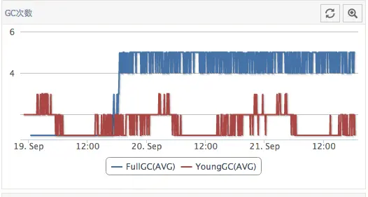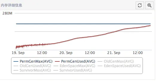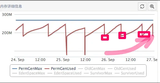 现象一:堆/Perm 区不断增长, 没有下降趋势(回收速度赶不上增长速度), 最后不断触发FullGC, 甚至crash(如下两张图是同一个应用的GC和Perm数据, GC触发原因确认是Perm不足) . 一般是现象二的晚期表现.