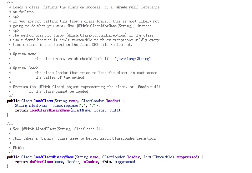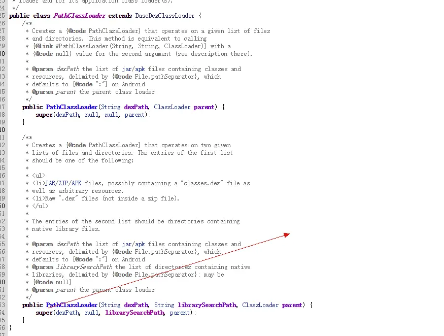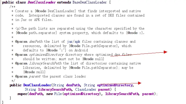 这里明显看出来我们的DexClassLoader和pathClassLoader构造函数传参上面就有不同,DexClassLoader需要提供一个额外的path路径,这个path路径我们看下注释很容易理解:用来存放解压缩以后的dex文件。(apk和jar包解压缩都可以 只要解压缩以后的是dex文件),这个path就是解压缩的目标路径。但是PathClassLoader就没有这个构造函数。只能直接操作dex文件。 总结: DexClassLoader可以加载任何路径的apk/dex/jar PathClassLoader只能加载/data/app中的apk,也就是已经安装到手机中的apk。这个也是PathClassLoader作为默认的类加载器的原因,因为一般程序都是安装了,在打开,这时候PathClassLoader就去加载指定的apk(解压成dex,然后在优化成odex)就可以了