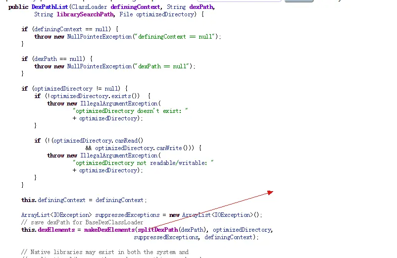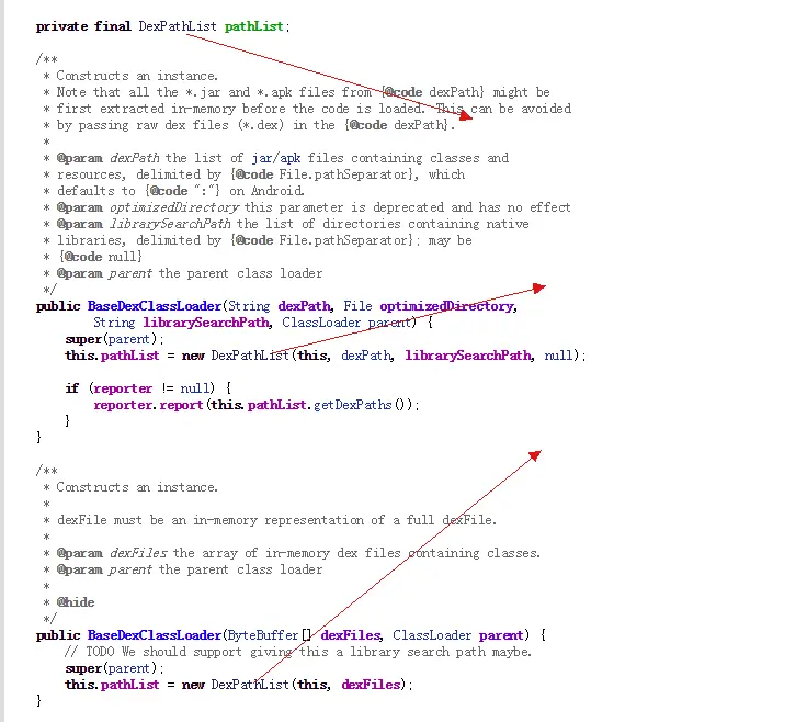 可以看出来BaseClassLoader的构造函数 最终是调用的DexPathList函数,注意这里2个构造函数也是分别对应的dex和path 两种classLoader的