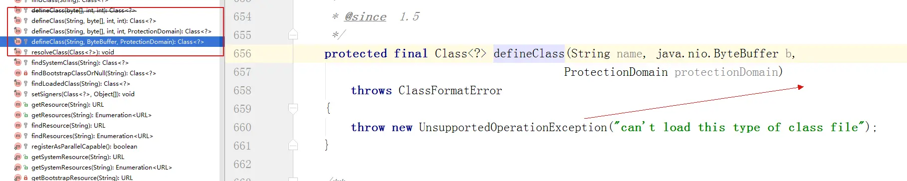 还记得在我之前的JVM那篇文章的结尾,我自定义了一个ClassLoader,通过读取了一个本地class文件,然后传递了 一个byte数组 到defineClass这个方法里从而成功的加载了一个本地class,但是在android中,这种方法是不被允许的。 我们来看看源码: