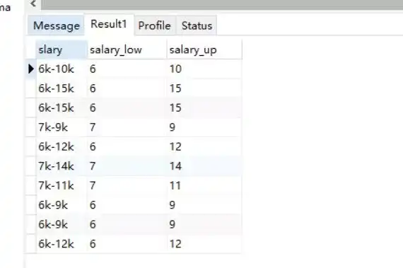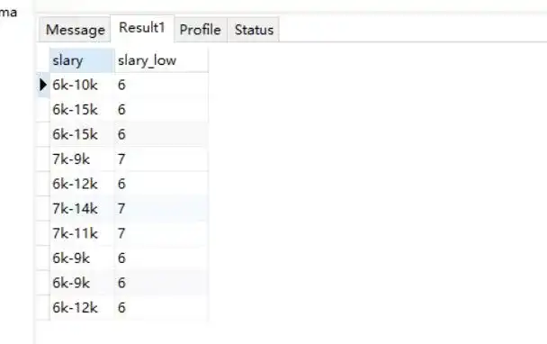 SELECT slary,substring_index(substring_index(slary,'-',1),'k',1) as slary_low from db1.str_date; -- 截取薪资下限