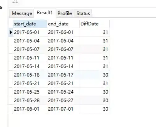 SELECT start_date,end_date,DATEDIFF(end_date,start_date) AS DiffDate from db1.str_date;
