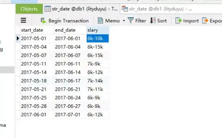 我的MySQL数据库中已经建好了一个包含两列日期与一列薪资范围字段。(深感通过R或者Python建表然后写入MySQL的效率要比使用MySQL自己的编辑器写方便!)