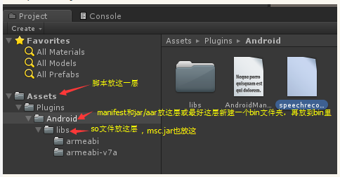 2)拷贝aar/jar文件、AndroidManifest.xml文件、so文件至如下目录注意:安卓5.0以上系统需要armeabi-v7a,不然会出现21002的错误