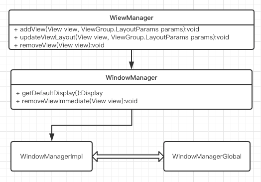 WindowManager继承与ViewManger,从ViewManager这个类名来看就是用来对View类进行管理的,从ViewManager接口中的添加、更新、删除View的方法也可以看出来WindowManager对View的管理。