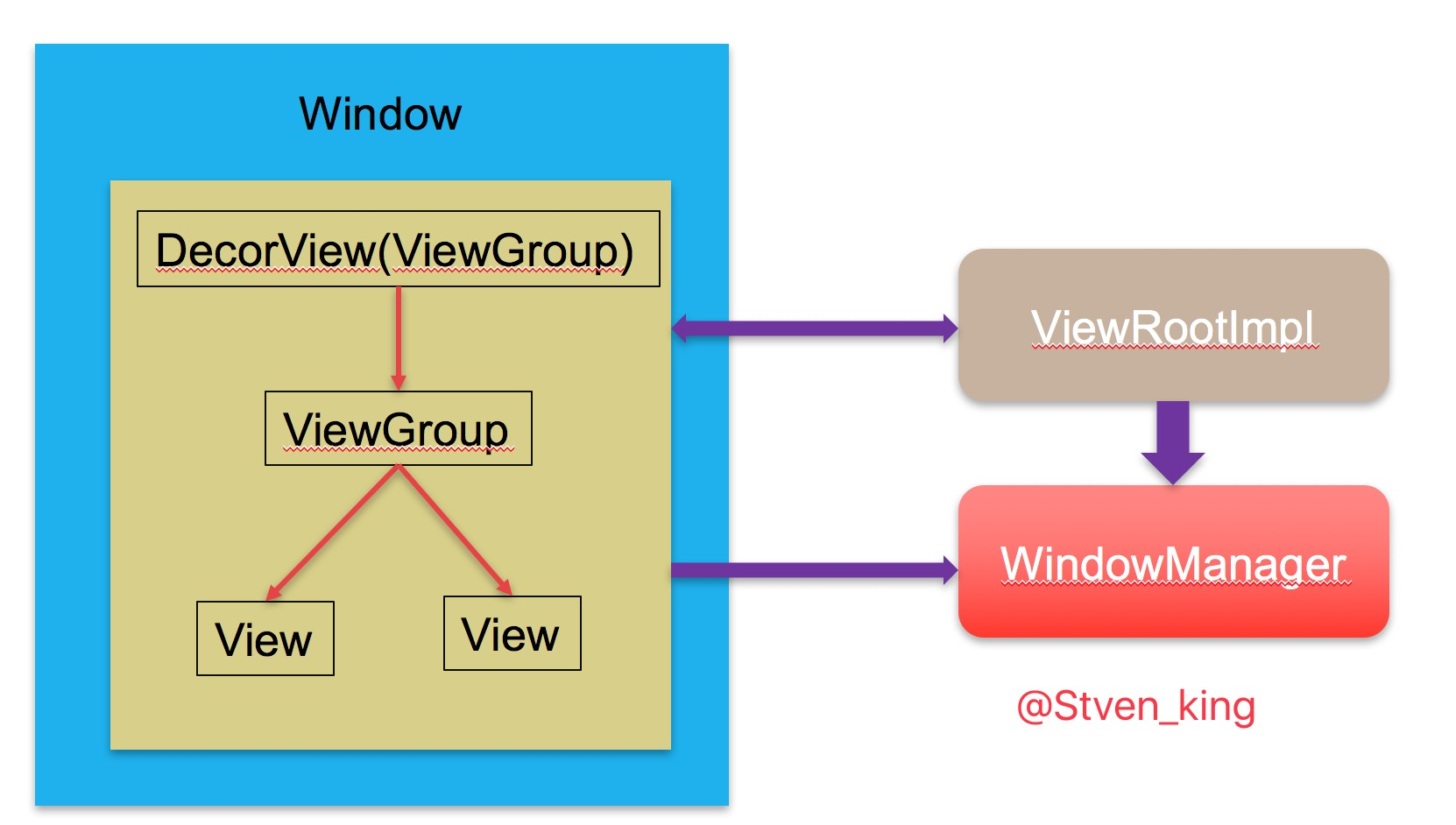 ViewRootImpl是View中的最高层级,属于所有View的根(但ViewRootImpl不是View,只是实现了ViewParent接口),实现了View和WindowManager之间的通信协议,实现的具体细节在WindowManagerGlobal这个类当中。