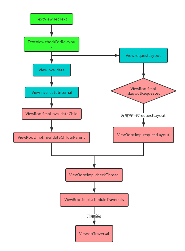 异步线程中到底是否能对视图进行更新呢?我们先看看TextView.setText方法的代码执行流程图。
