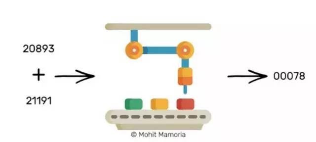 假设我给了你两个盒子。第一个盒子里面有数字20893,你能不能想出一个数字,这个数字与第一个盒子里的数字相加后的结果放入魔法机器后,我们能够得到一个以3个零为开头的字符结果。