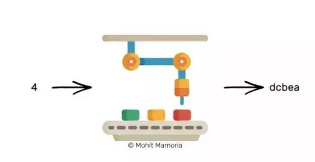 如果我们把装有数字4的盒子从左边放进去,它会从右边给出下列字符:dcbea。