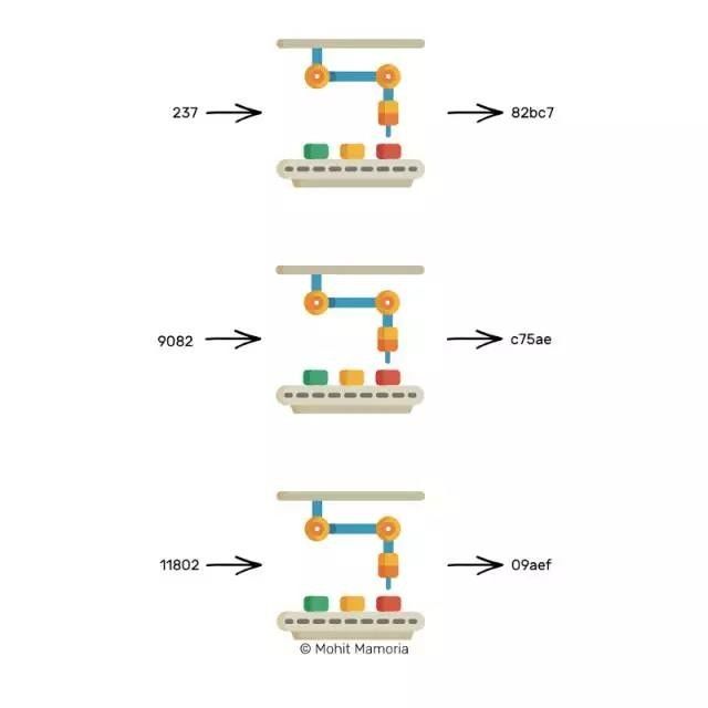 【术语解析】这个机器实际叫作“哈希函数”,但是今天我们不讨论技术。所以我们暂且称它为“魔法机器”。