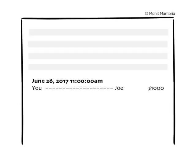 回头我们再来看看刚刚到底发生了什么。你和Joe都信任那家银行来管理你们各自的财产。整个过程中实际并没有真实货币的物理流动。整个过程只涉及录入系统的两个账户即可。更准确地说,全程只需主动权属于该银行的两个账户就可以完成。