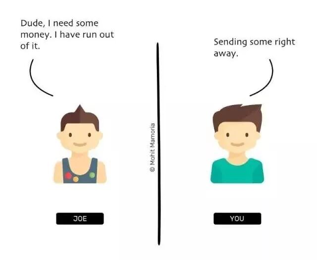 Joe是你最好的朋友。他出国旅游后的第五天给你打了个电话:“兄弟,我需要点钱,出国之后把身上的钱都花完了。”