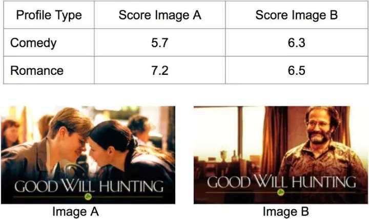(图 3:根据用户个人资料进行的情境图像选择示例。Comedy 指主要观看喜剧片的个人资料,Romance 代表看爱情片最多的用户个人资料。情境 bandits 算法为更喜欢喜剧片的会员推荐了带有著名喜剧演员罗宾·威廉姆斯(Robin Williams)形象,同时更为浪漫的情侣接吻图片。)