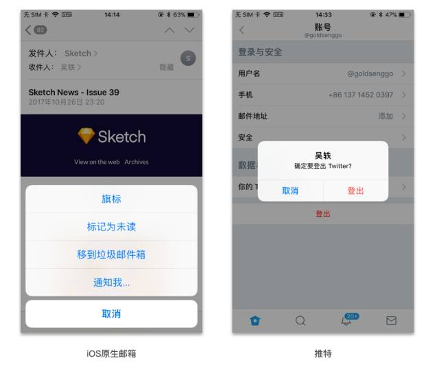 例如:iOS原生邮箱,点击“更多”出现底部操作列表,展示四种操作选项。推特的退出登录仅需要二次确认使用的是警示框。