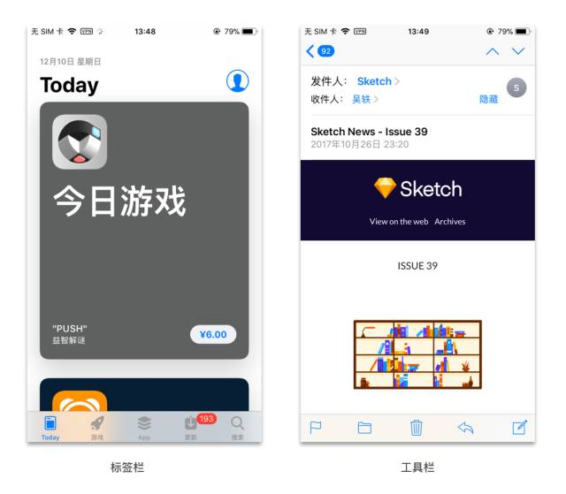 例如:app store中底部的标签栏和iOS原生邮件详情的底部工具栏。
