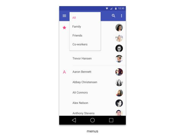 菜单:是临时的一张纸(paper),由按钮(button)、动作(action)、点(pointer)或者包含至少两个菜单项的其他控件触发。