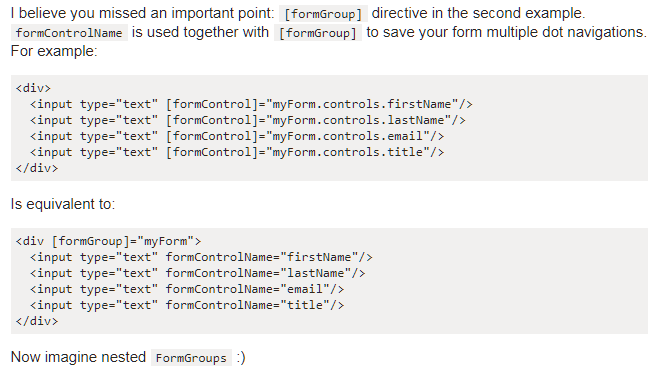 FormControl实例绑定到表单控件元素。这两个指令确保以程序写入的方式将FormControl的值写入到DOM元素中去(模型->视图,Model->View),其二也确保用户输入到DOM的值反应到FormControl的实例中。(视图->模型,View->Model)。 - 不同点:FormControlName一般和FormGroup嵌套使用。