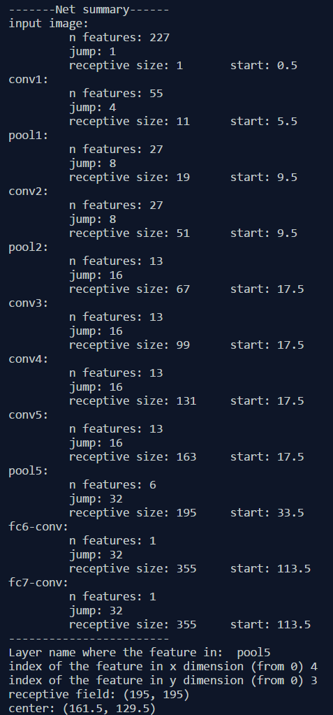 这里给出一个python小程序,用于计算给定CNN架构下所有层的感受野信息。程序允许输入任何特征图的名称和图中特征的索引号,输出相关感受野的尺寸和位置。图4给出AlexNet下的例子。