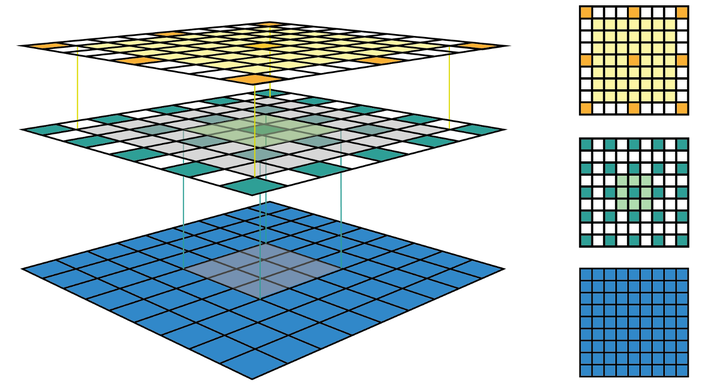 图2展示了另外一个例子,采用相同的卷积核C对7*7大小的输入图进行卷积操作。这里给出了3D(左图)和2D(右图)表示下的固定尺寸CNN特征图。注意:图2中感受野尺寸逐渐扩大,第二个特征层的中心特征感受野很快就会覆盖整个输入图。这一点对于CNN设计架构的性能提升非常重要。
