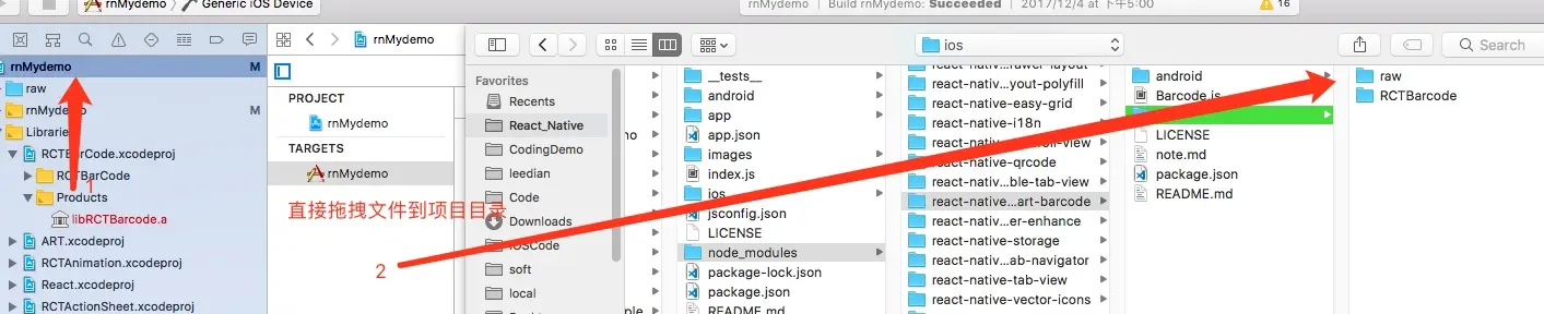 4.将\node_modules\react-native-smart-barcode\ios\raw 文件夹拖到到Xcode项目中(确保文件夹是蓝色的),如下图: