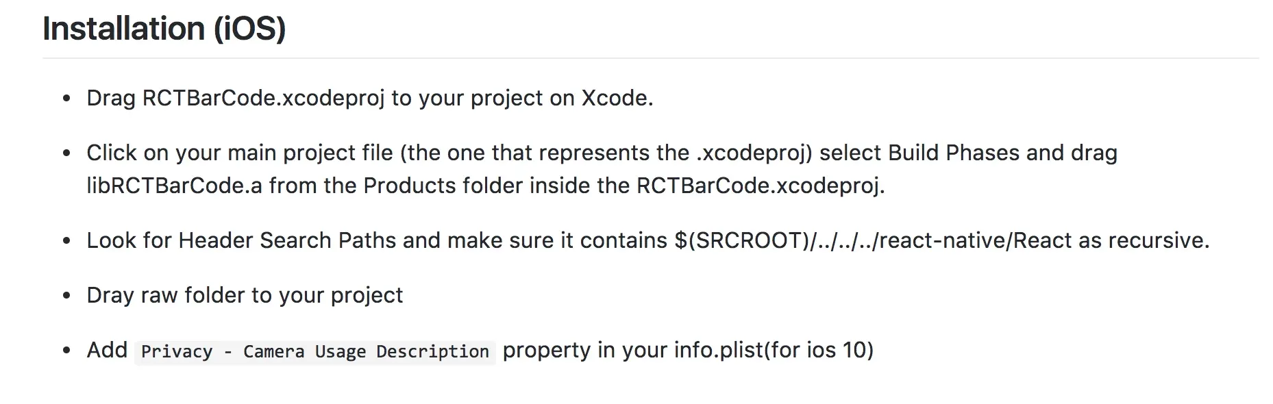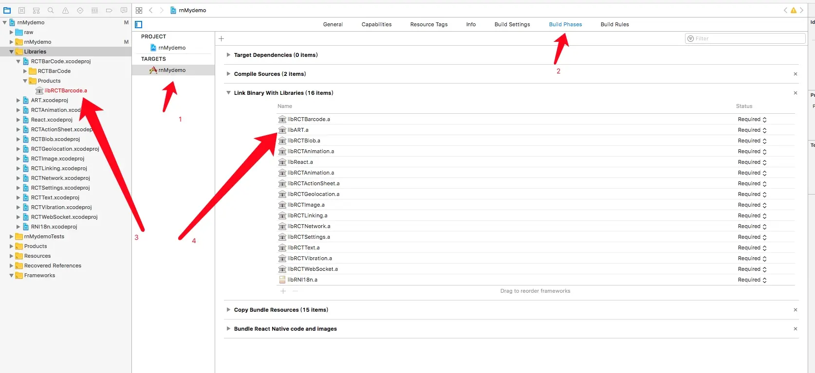2.添加依赖,Build Phases->Link Binary With Libraries 加入RCTBarCode.xcodeproj\Products\libRCTBarCode.a(直接拖),如下图: