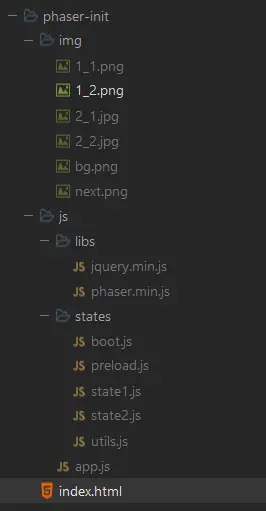 img文件夹下的图片可以自行从 案例代码地址 上拷贝,然后你会发现,咦,GitHub上怎么多了一张 sprites.png 图片和一个 sprites.xml 文件,这个后面将会讲到,现在我们只需要准备现阶段需要的,js/libs文件下的 jquery.min.js 和 phaser.min.js 请自行准备或从 案例代码地址 上拷贝,然后其它文件我们需要保证空白以便我们后面迅速填充内容。