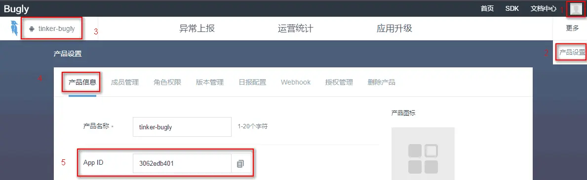 通过“产品设置”,选择刚刚创建的产品(图中第3步),可以查看到产品对应的App ID。