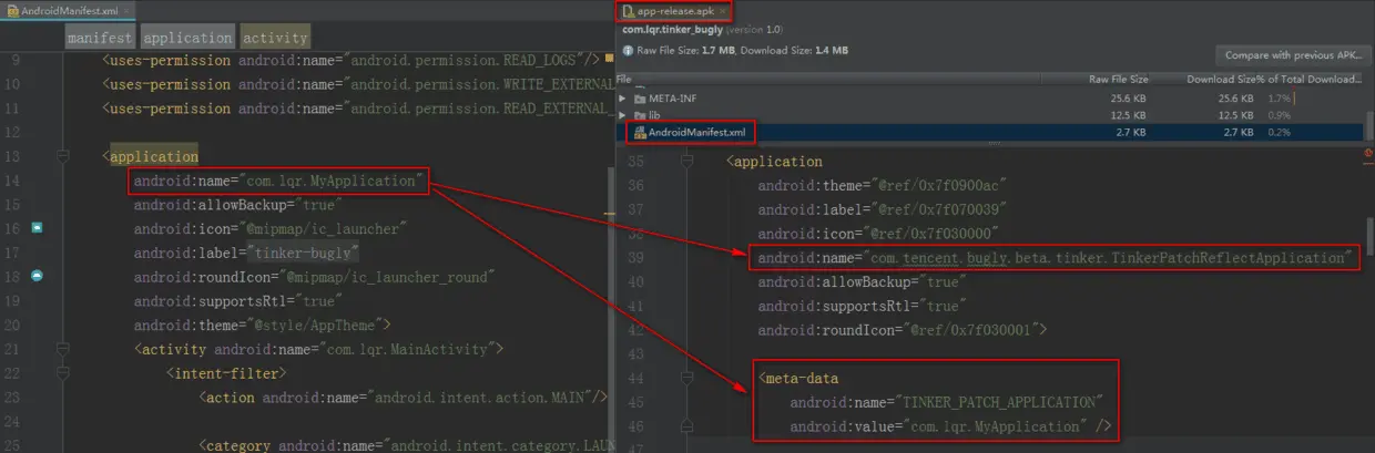 像我就犯过这样的错,明明在tinker-support.gradle文件中设置了enableProxyApplication = true,结果在AndroidManifest.xml中却声明了TinkerApplication的继承类。