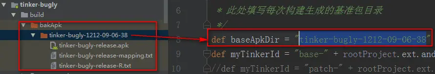 baseApkDir是基准包(也称基线包)的目录,在生产补丁时需要根据基准包在bakApk下具体文件夹名字修改,如:bakApk/xxxx,到时生成补丁包时要将baseApkDir的值改为xxxx。(xxxx是Tinker自动生成的,根据时间戳来命名)。