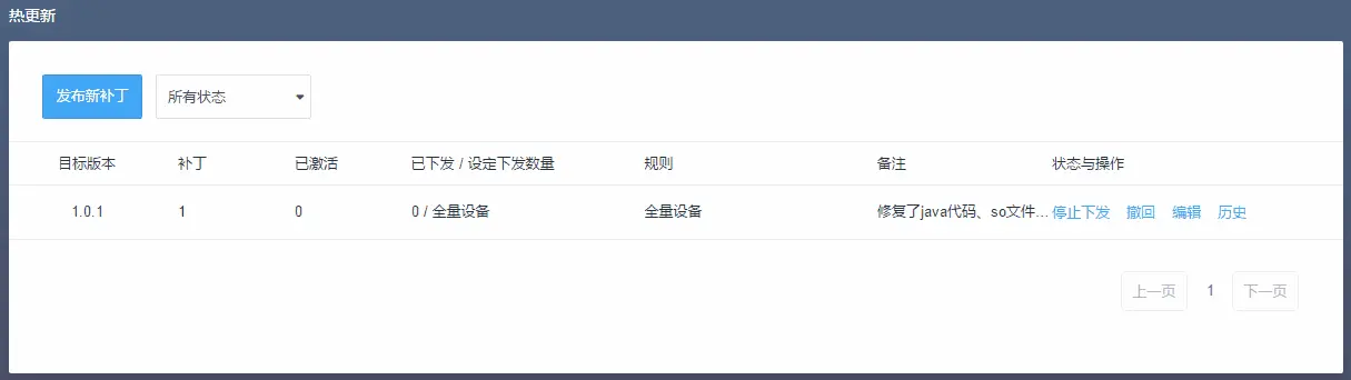 - 停止下发:不再把该补丁下发到客户手机上(停止后可重新开启)。