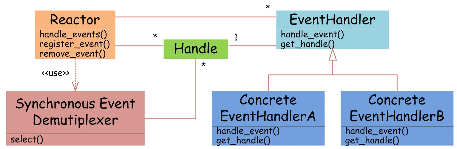 如图4所示,EventHandler抽象类表示IO事件处理器,它拥有IO文件句柄Handle(通过get_handle获取),以及对Handle的操作handle_event(读/写等)。继承于EventHandler的子类可以对事件处理器的行为进行定制。Reactor类用于管理EventHandler(注册、删除等),并使用handle_events实现事件循环,不断调用同步事件多路分离器(一般是内核)的多路分离函数select,只要某个文件句柄被激活(可读/写等),select就返回(阻塞),handle_events就会调用与文件句柄关联的事件处理器的handle_event进行相关操作。