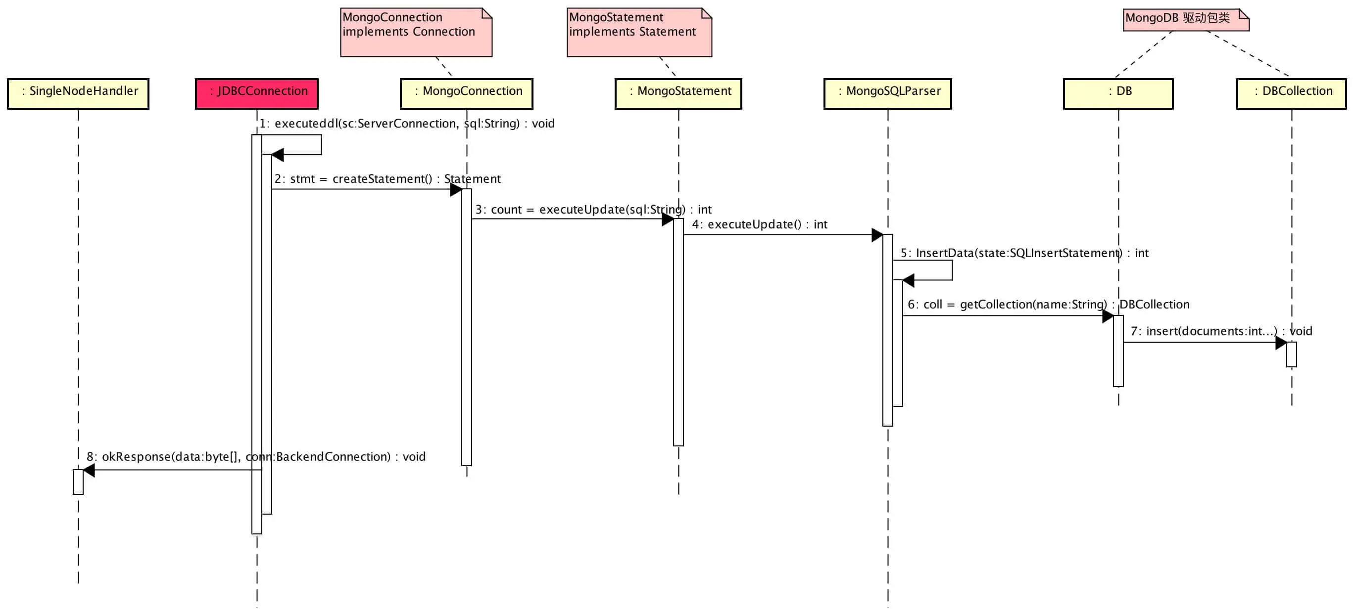 MyCAT 使用 JDBC 规范,抽象了对 MongoDB 的访问。通过这样的方式,MyCAT 也抽象了 SequoiaDB 的访问。可能这样说法有些抽象,看个类图压压惊。