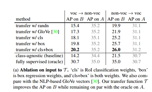 Input to T 这个实验探究T的输入是什么好。从图a可以看出,显然是Wcls+Wbox一块传入T函数会获得更好的效果。然后看到,虽然本文方法在B上测试不如oracle的效果好,毕竟训练时没用到B的mask信息,但是,在A上的测试却比oracle略好,说明,本文的方法没有牺牲了强监督的效果来换取在B上的表现。