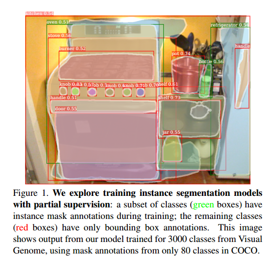 本文是FAIR几位大神的最新作品。文章挺有意思地提出一种部分监督学习分割的方法。简单来说就是学习一个将检测参数迁移为分割参数的函数,从而实现在分割信息不完整的数据集上训练,并且测试阶段能对训练阶段没有分割信息的类别也能预测其实例分割掩膜。论文链接